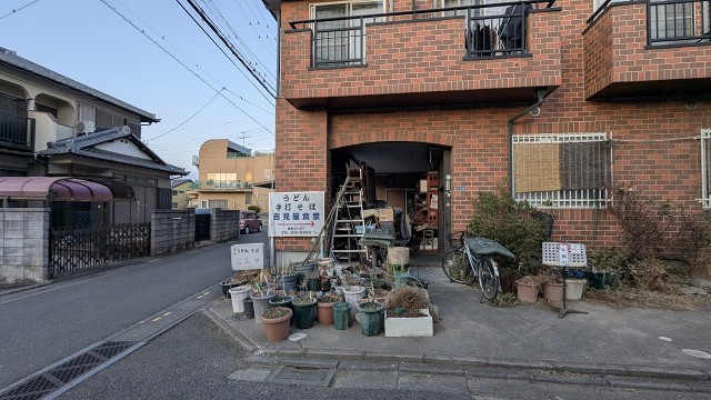 住宅地の只中、マンションの1階がお店のようだ なにやら物が散らかって乱雑な店構え しかしまだ開いていない様子
