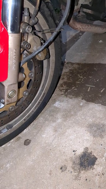 ウィンカーのインジケーターの不調を修理中、Fフォークの下にシミができているのに気がついた 嫌な予感…