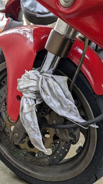 キャリパをクリーニングして、やや重くなっていたピストンを揉み出し 各部グリスアップし新品パッドを取り付けて完了 今度時間のある時にフルードも交換しておきたい