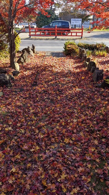 水面のモミジのはまだ色づき途中で、真っ赤に染まるのは来週あたりだろうか。去年来た時はようやく色づき出したくらいの時季で、葉っぱはまだ緑ばかりでちょっと外してしまったが、今年は美しい紅葉を見られて満足である。一昨年はこんな感じ。