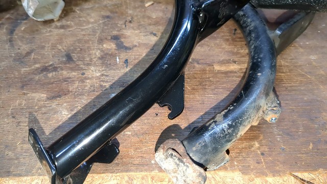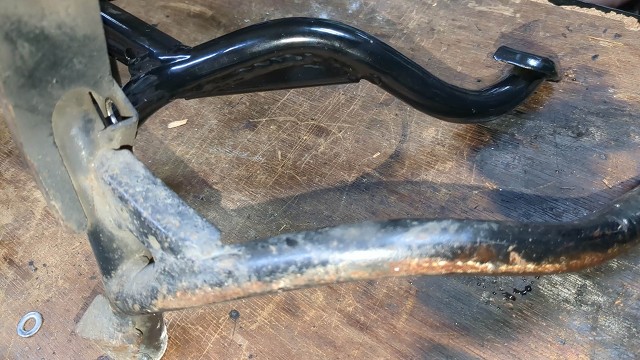 届いた品を見ると形状、溶接も問題なし 右の純正スタンドの失われたフック痕が悲しい… とはいえ地面に当たる底板部分もかなり削れてたり変形してたから、結局は交換して良かったな