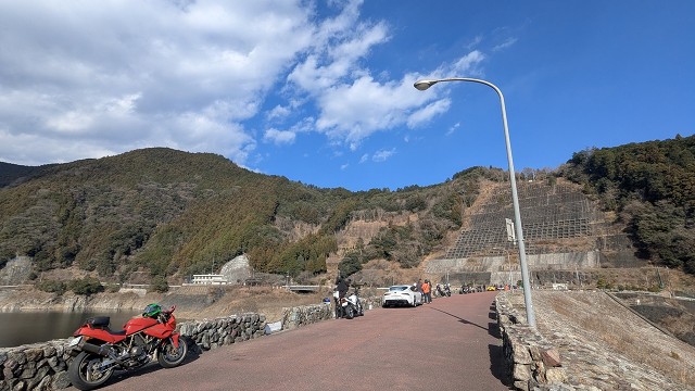 有間ダムに休憩に立ち寄ると、さすが年末 たくさんのバイクと車で賑わってる