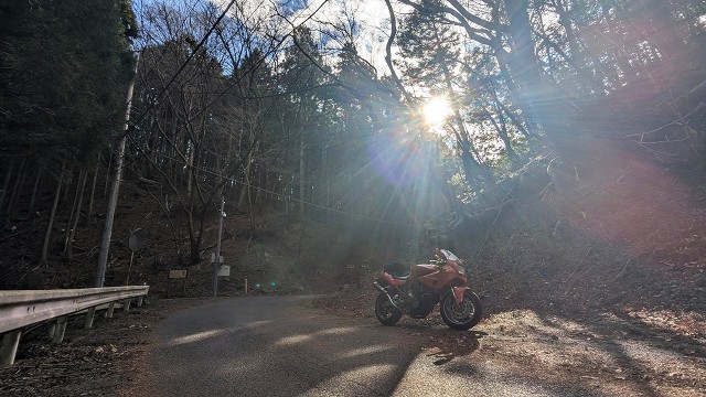 ひっそりとした峠道 でも思ったよりぜんぜん陽射しが入ってくるな 冬場で枝葉の密度が低いのかも