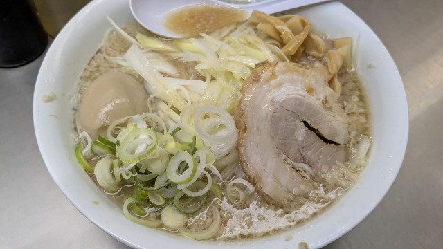 来た来たこれですよ ネギラーメン(+玉子) 濃さも脂もオッサンにはこのくらいがちょうどいい 夜中のニンニク最高!